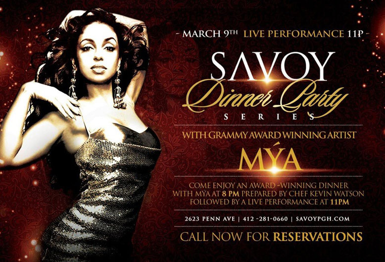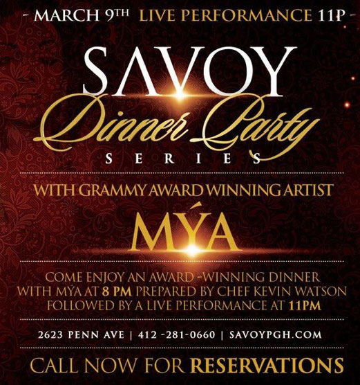 Come enjoy an award-winning dinner with Mya at 8pm prepared by Chef Kevin Watson followed by a live performance at 11pm.