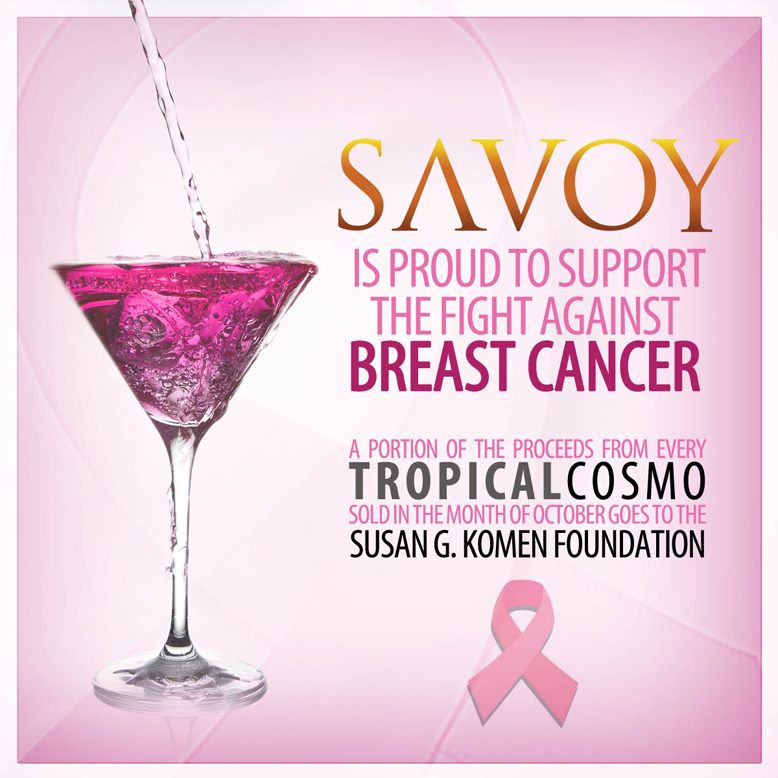 In support of Breast Cancer Awareness Month, a portion of the proceeds from every pink Tropical Cosmo sold at SAVOY Restaurant in October will go to the Susan G. Komen Foundation!