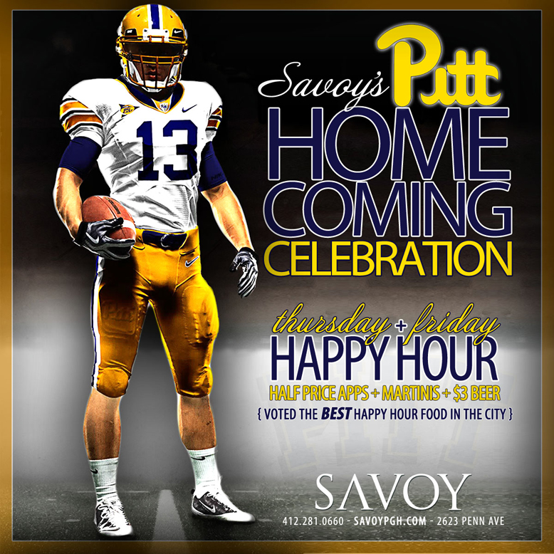 Join us for SAVOY Restaurant & Lounge's Pitt Homecoming Celebration!! Enjoy half off appetizers and martinis and $3 beer during Happy Hour on Thursday and Friday! Call 412.281.0660, for reservations.