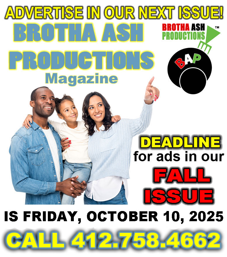 TO ADVERTISE IN OUR FALL ISSUE CALL 412.758.4662 OR EMAIL US AT BrothaAsh@gmail.com