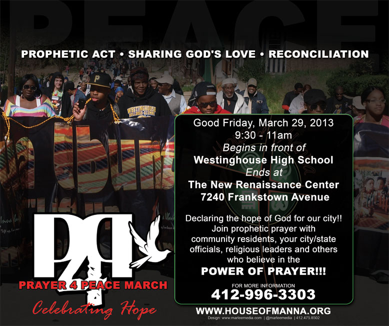 On March 29th, The House of Manna Faith Community (HOM) will gather hundreds of people in front of Westinghouse High School, 1101 North Murtland Street for its fourth (4th) annual “Prayer 4 Peace March”. The march, led by community youth, will proceed through Homewood-Brushton to the site of it’s future home “The Renaissance Center”, located at 7240 Frankstown Ave. Pittsburgh, Pa 15208 (The formal Family Dollar). The march will begin at 9:00am.