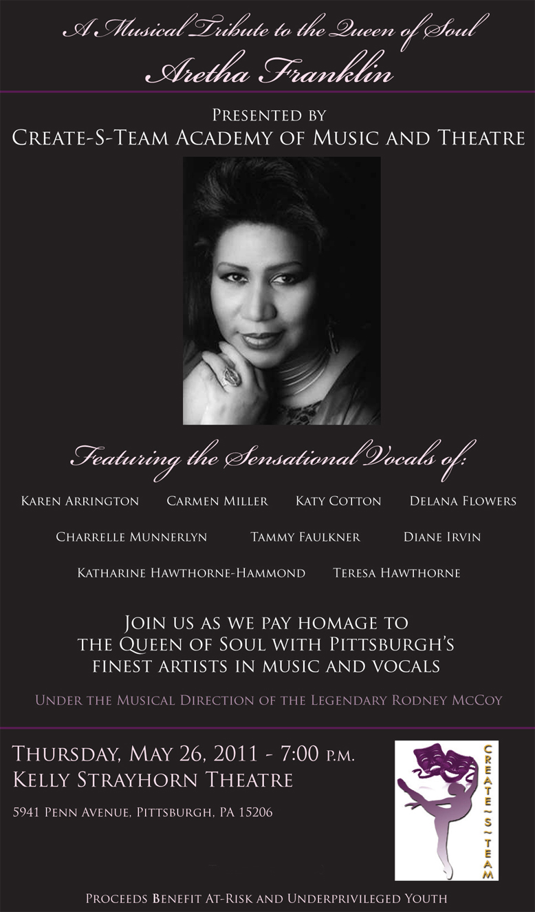 HERE and click on A MUSICAL TRIBUTE TO THE QUEEN OF SOUL ARETHA FRANKLIN, THURSDAY, MAY 26, 2011 AT 7PM AT THE KELLY STRAYHORN THEATRE
